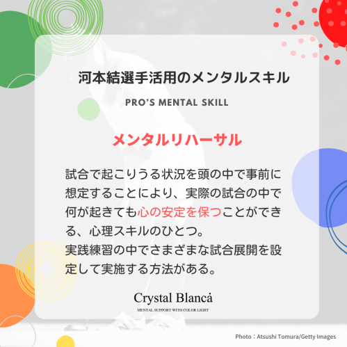 メンタルリハーサルとは、試合で起こりうる状況を頭の中で事前に想定することにより、実際の試合展開の中で何が起きても心の安定を保つ、心理スキルである。